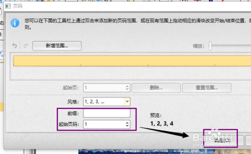5、之后再下风格选项的下方还可根据个人需求选择给页码添加前缀,以及设定添加页码的起始页。在全部设定好之后,点击右下角的确定键就大功告成了。