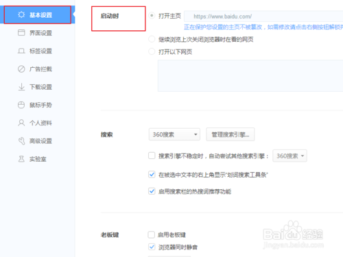2、在选项页面,选择“基本设置”中的启动时部分进行设置。