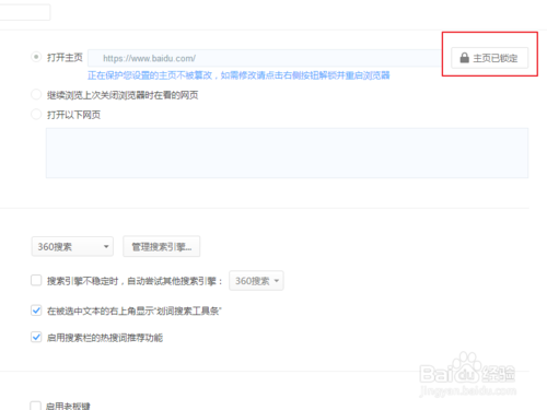 3、此时我们可以看见打开主页后面的输入框不能输入自己想要设置的主页,这是因为主页被锁定不能修改。此时需要点击“主页已锁定”,进行主页锁定解锁。