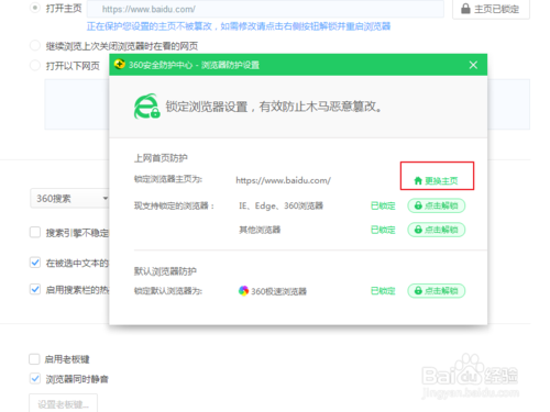 4、在此页面直接点击“更换主页”,会出现如下提示。是因为主页锁定还没有解锁无法修改。