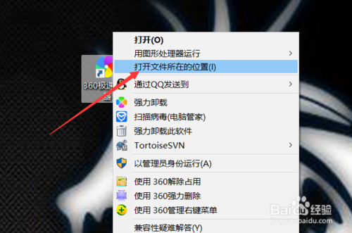 1、在桌面上找到360浏览器的图标并选中,然后点击鼠标右键,再点击弹出菜单里的【打开文件所在的位置】,如下图所示。