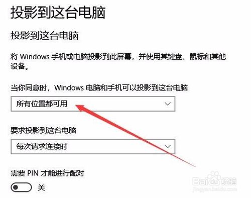 4、在右侧窗口中点击“当你同意时,With电脑和手机可以投影到这台电脑”下拉菜单,选择“所有位置都可用”菜单项。