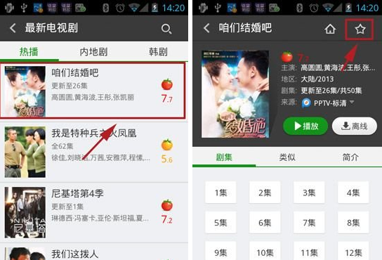 2、除了看精选的电视剧或电影外我们还可以收藏至收藏夹,下面小编以现在的热播剧咱们结婚吧为例,打开后点击右下角的星星标示可以收藏该电视剧,还可以离线下载电视剧。