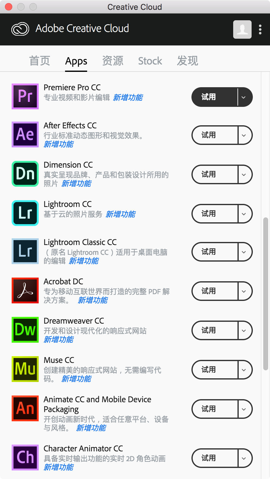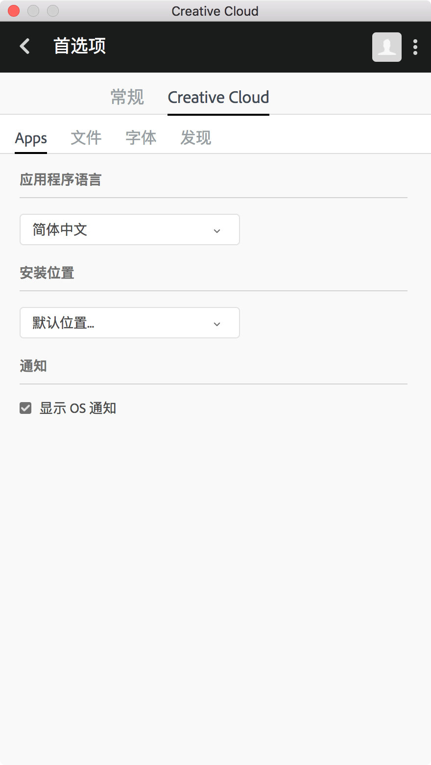 Adobe Creative Cloud安装完毕后,打开,用你之前免费注册的账号登陆,进入Apps这页,就可以看到Adobe全家桶了,选择你的喜欢的程序,尽情的安装吧,注意,在设置页面切换到中文。