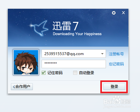 在弹出的登录界面输入账号和密码,点击右下角的“登录”按钮,我用的是迅雷7,可能会和其他版本有所差异,但是具体操作流程一样;