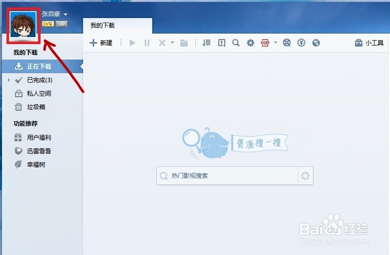 登录完成后,点击图片左上角的方框,进入“迅雷个人中心”,迅雷登录完成后的界面左上角的方框里面是一个小人的头像,因不易发现特意标上红色方框;