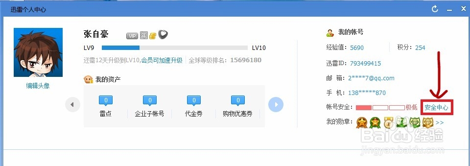 在“迅雷个人中心”页面点击右侧的“安全中心”按钮;