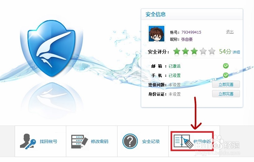 进入“安全中心”,点击图片下方的“账户申诉”按钮;