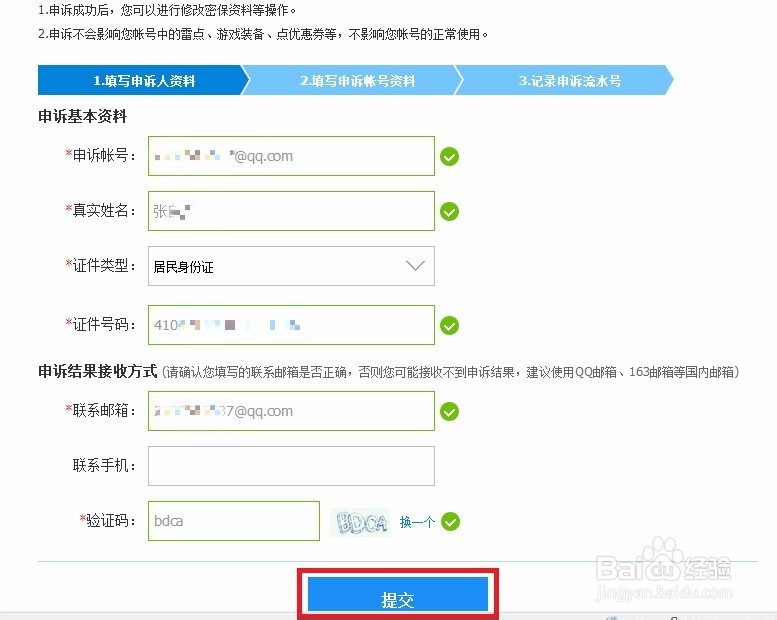 “申诉基本资料”提交完成后进入填写“申诉账号资料”界面,如实填写账号资料,填写完成后点击下方的“提交”按钮(申诉账户资料的填写内容有很多,如实填写就可以,再此不做太多说明)