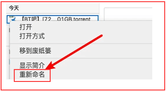 2、在弹出的菜单里,选择‘重命名’,把bt文件改名,改成不含敏感文字的名。