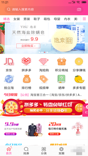 1.品类丰富:服饰、电器、居家、美妆、母婴、水果全覆盖,专注于找到最合适你的商品。2.任性包邮:9块9也包邮,实惠多多。