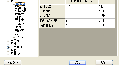 14、超高构件计算范围设置:管道长度、外表面积、内表面积、绝热保温体积、保护层面积
