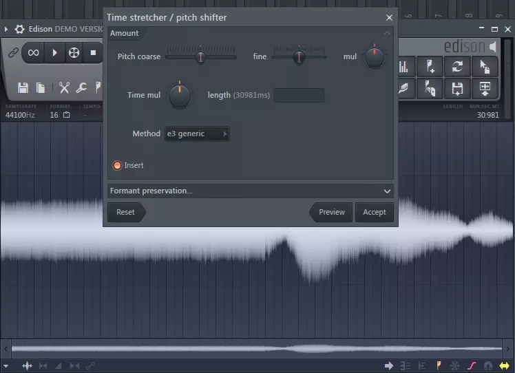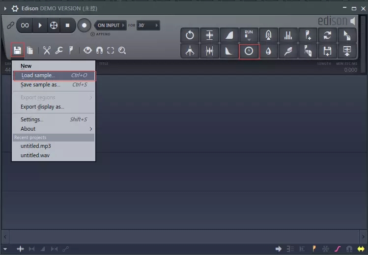 然后搜索插件,找到 Edison 插件,在新通道中打开,图示即为变速变调处理按钮。加载一个采样作为示例。