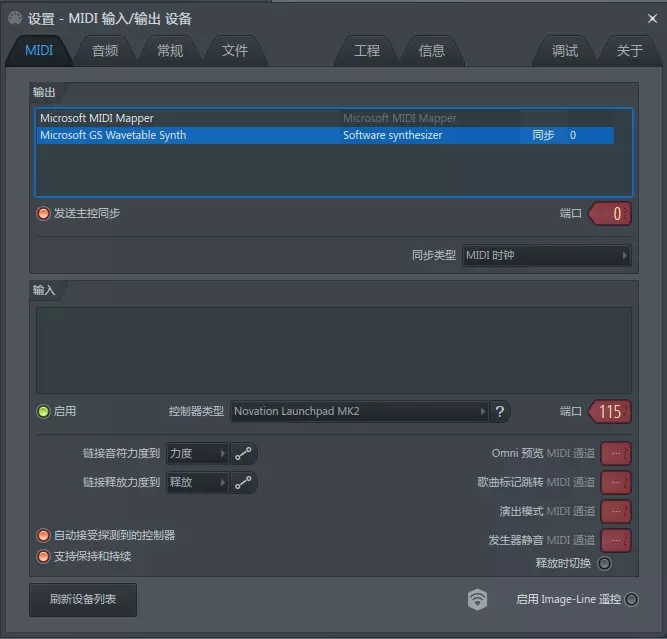 首先打开软件 FL Studio 20,在菜单栏选项中,打开 MIDI 设置(或使用快捷键 F10),弹出“设置-MIDI 输入/输出设备”,在 MIDI 下,输出设备右下角的端口设置为 116。输入设备下方的控制器类型选择 Novation Launchpad MK2,端口设置为 115。