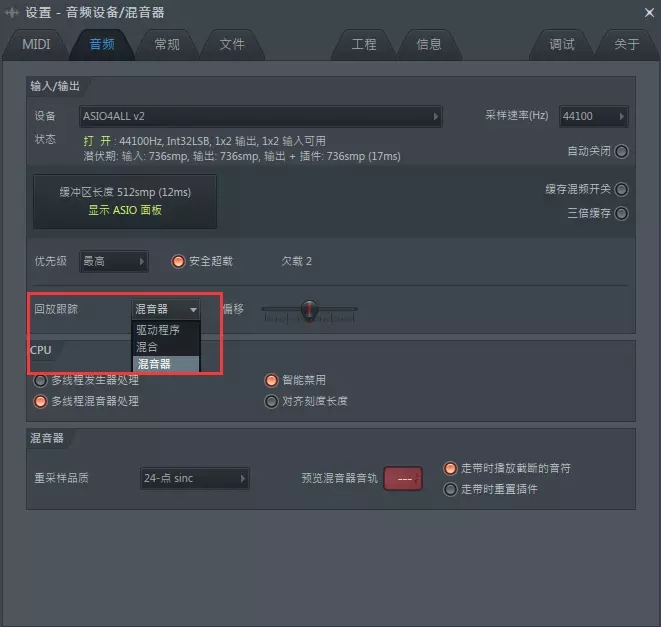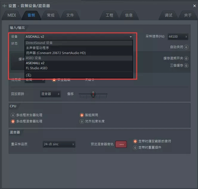 我们发现使用 FL Studio 软件自带的 ASIO4ALL v2和 FL Studio ASIO 就不会出现此情况,应该是外置声卡问题。