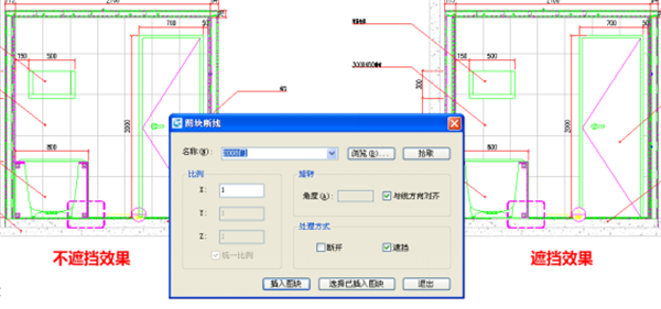 5、图块断线(BLOCKBREAK):可以在插入图块时自动打断或遮挡下面的线或图形,图块可自动与线对齐或随意设置旋转角度。