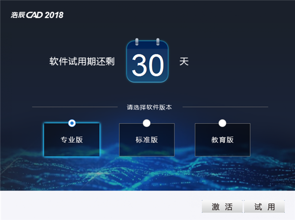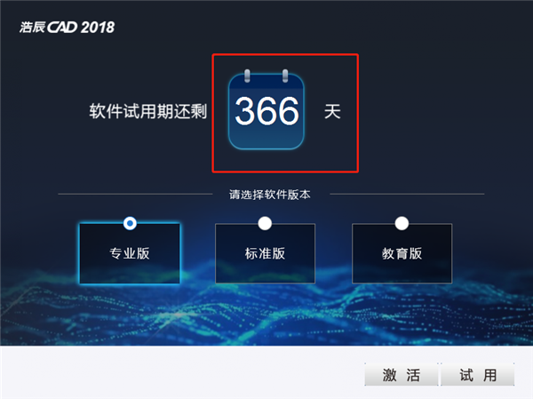 1、先运行浩辰CAD 2018安装包。2、安装完成后先运行软件,发现只有30天的试用期。别担心,先选择你想试用的版本,选择试用。有专业版,标准版,教育版。