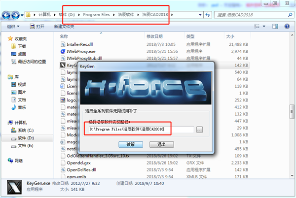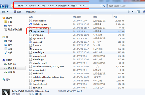 4、将破解工具KeyGen.exe放到软件的安装目录。(小编将软件安装在了D:\Program Files\浩辰软件\浩辰CAD2018)