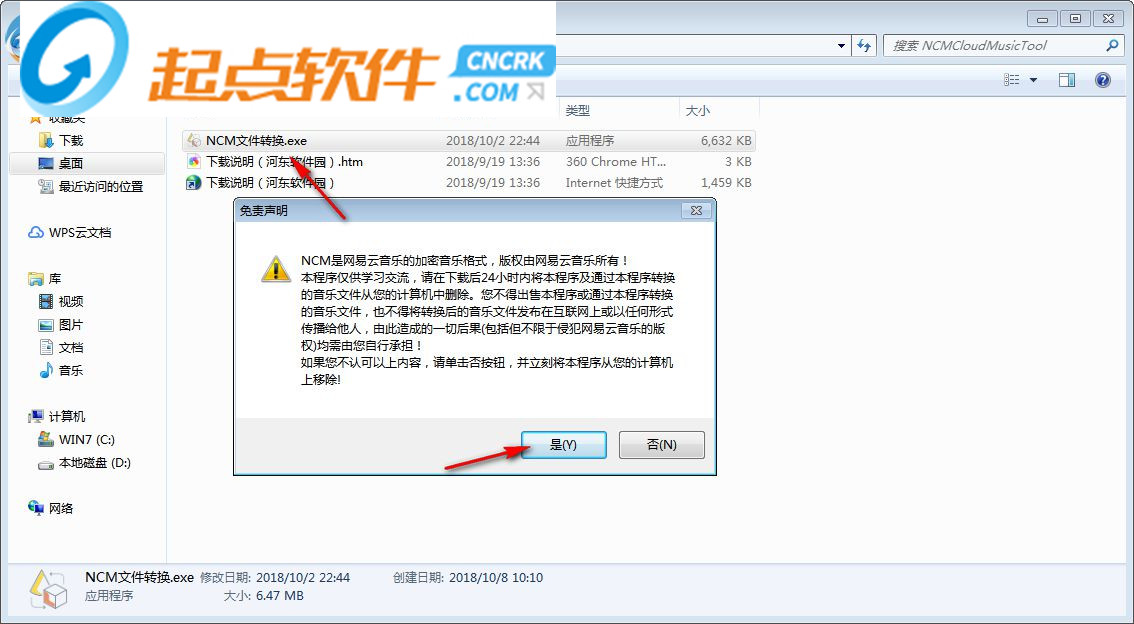 1、打开NCM文件批量转换器,这是软件的一些提示,你需要查看这里的内容,点击“是”