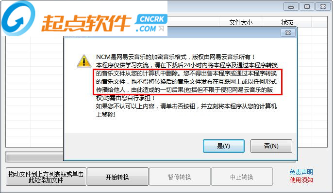6、NCM文件批量转换器的协议内容是必须阅读的,不能将转换完毕的歌曲随意发布到网上,否则可能侵权