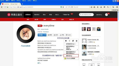 4.进入歌曲页面,在空白处点击右键,点选右键菜单中“查看元素”。