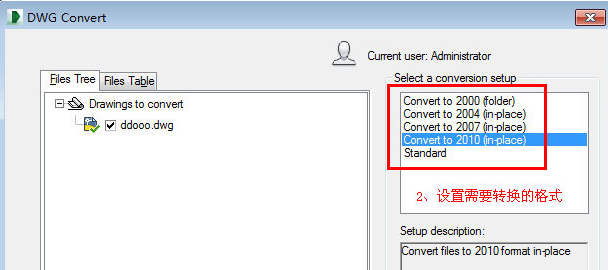 在“select a coversion setup”选择需要的转到的低版本。最后在底部点击覆盖"convert",出现读条。