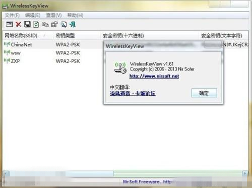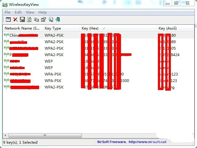 wirelesskeyview中文版是NirSoft出品的一款用于恢复存储于Windows XP 系统的"Wireless Zero Configuration"(无线网络零配置)服务和Windows Vista系统的 "WLAN AutoConfig"(无线局域网自动配置)服务中的所有无线网络密钥(WEP/WPA)的工具。它能保存所有的密钥到文本/HTML/XML文件或单独复制一个密钥到剪贴板. 免费软件WirelessKeyView 可免费电脑的无线网络密码,能同时免费多个无限网络的密码,软件界面最左边为SSID信号名称,第四项就是密码了。