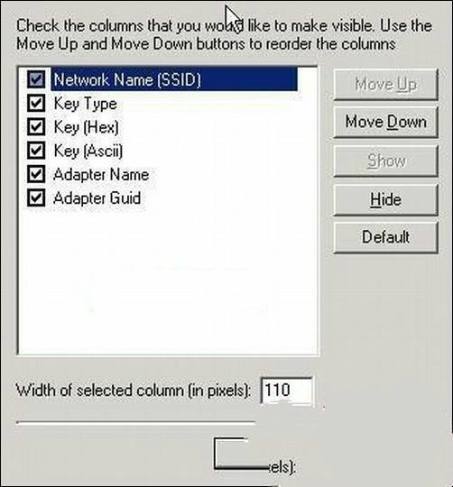 在“View”菜单中选择“Choose Columns”,在弹出的窗口中定制显示方式,比如仅仅显示无线网络名称和无线密码,选择“Network Name(SSID)”和“ Key(Ascii)”这两个选项就可以了。
