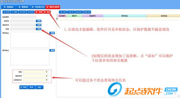 1、首先我们点击界面上的新增,使用新的系统编号,输入客户的微信号、淘宝账号和地址以及备用地址,在右侧会自动 填充上去,点击保存即可2、可以使用工具栏中的数据备份和数据恢复功能一键备份和恢复你的数据