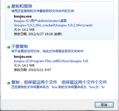 6、先不要运行软件,打开crack文件夹,将破解文件“boujou.exe”复制到安装目录下覆盖源文件,默认安装目录为C:\Program Files (x86)\\boujou 5.0;