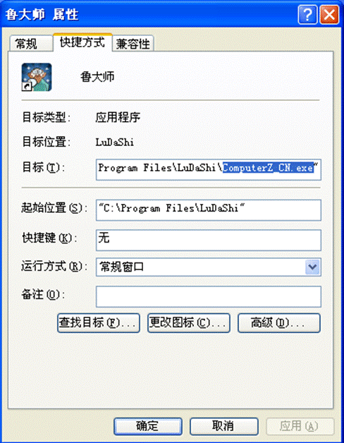 2、属性页面中,留意一下“目标”指向的最后一节,是不是\ComputerZ_CN.exe 结尾(如果不是,那么请提高警惕,这个鲁大师图标可能是假的):