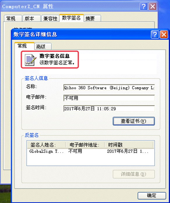 6. 同前面的攻略一样,查看数字签名即可(若显示“该数字签名正常”为真鲁大师):