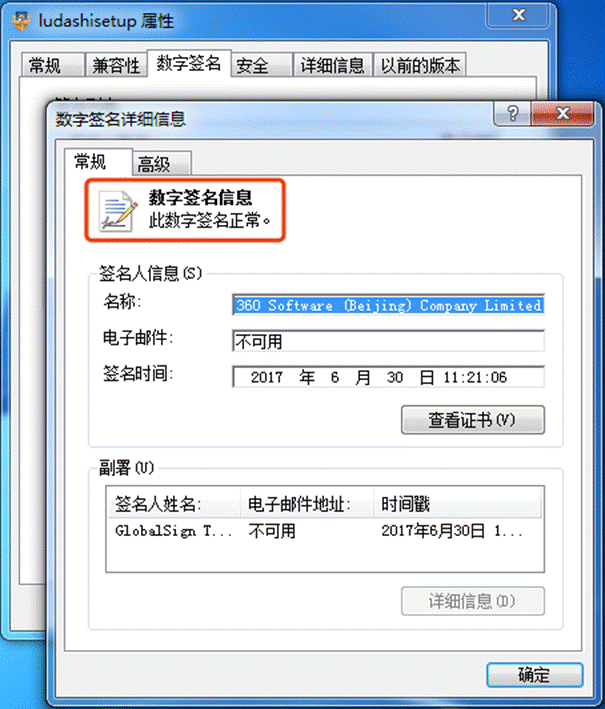 4、最终会打开一个”数字签名详细信息“窗口,此时如果看到左上角显示“此数字签名正常。”,并且下面“签名人信息 — 名称” 后的文本框中,显示的内容是“Qihoo 360 Software (Beijing) Company Limited”,那么表示此安装包确实是鲁大师签发的,是合法可信的文件。