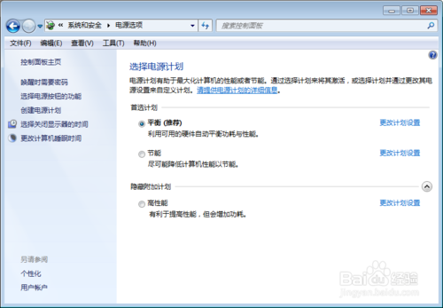 在“电源选项”中,我们可以看到当前选中的电源计划方案是什么,图中是系统的默认设置,如果鲁大师节能省电方案起作用时,这里的“平衡”计划,显示的是“鲁大师节能省电方案”,并且在下方的文字说明里写明“需要在鲁大师中关闭该方案”。