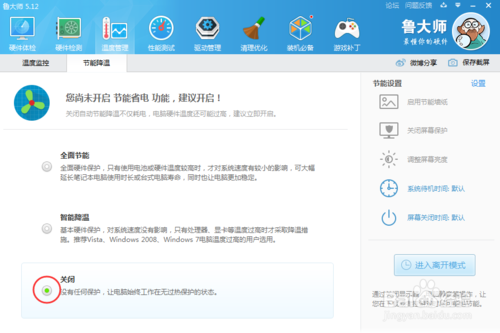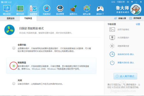 打开鲁大师软件,进入“温度管理”界面。其中有两个选项卡可以切换,切换到“节能降温”选项卡。如图所示,可以看到当前的设置是“智能降温”。