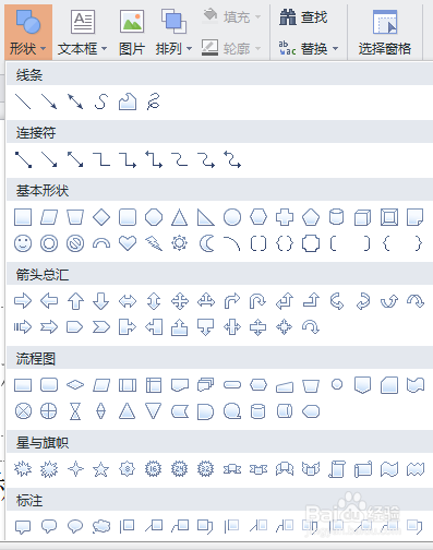 点击菜单栏的“形状”,可以看到可以添加很多自定义的形状