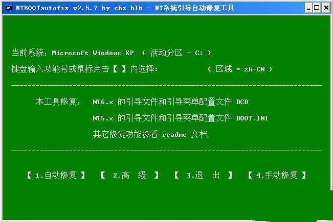 第2步:解压后直接打开NTBootAutofix修复工具,然后在主界面点击“1.自动修复”的选项,就会出现窗口内的如下修复内容: