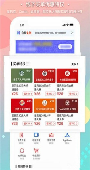 不限量全网低价娱乐充值线下买单优惠特权,大牌餐饮便利店通兑券