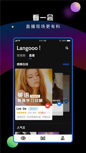 朗果英语软件有全球潮流短视频、受欢迎的达人直播、智能的1对1在线视频教学,