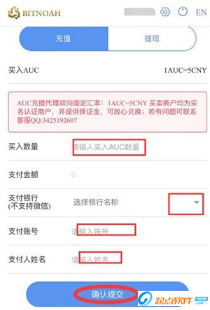 充值即使用人民币兑换Auc,兑换比例AUC:人民币=1:5,充值AUC后可在AUC交易区进行币种交易,具体AUC充值流程如下: