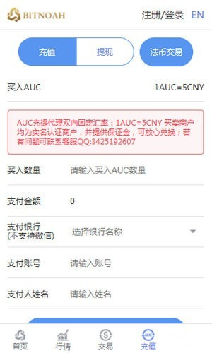 比特诺亚如何充值?充值即使用人民币兑换Auc,兑换比例AUC:人民币=1:5,充值AUC后可在AUC交易区进行币种交易,具体AUC充值流程如下: