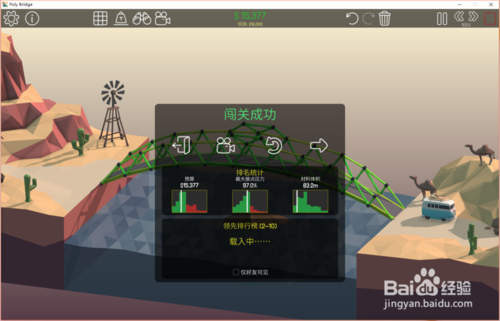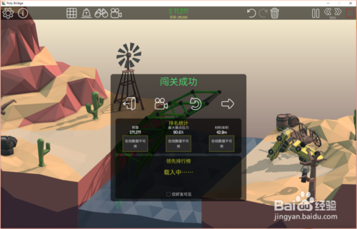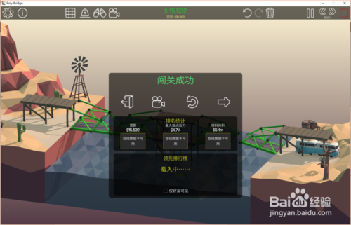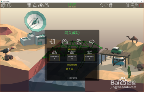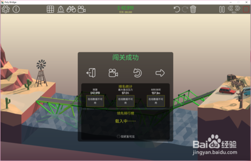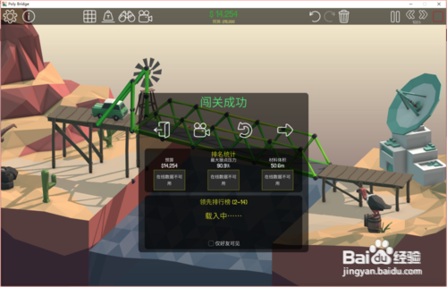 8、点击开始模拟按钮,测试通过结果如下:预算9329;压力25.7%;材料体积37.8(可以看到这次车辆顺利通过,桥梁也没有损毁,而且三项数值都是非常理想的)