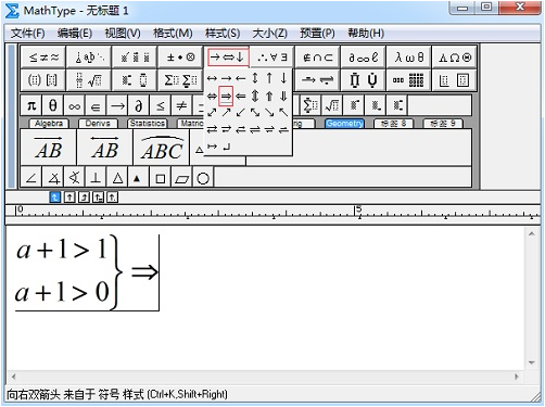 3.将光标放在大括号右边,在箭头模板中选择向右双箭头符号;再次应用前述办法,做出第二个右括弧。