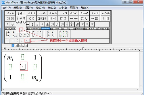 2.输入元素后将光标放在所需的位置,在矩阵标签下选择省略号模板输入,或者在空格和椭圆模板中选择省略号输入。