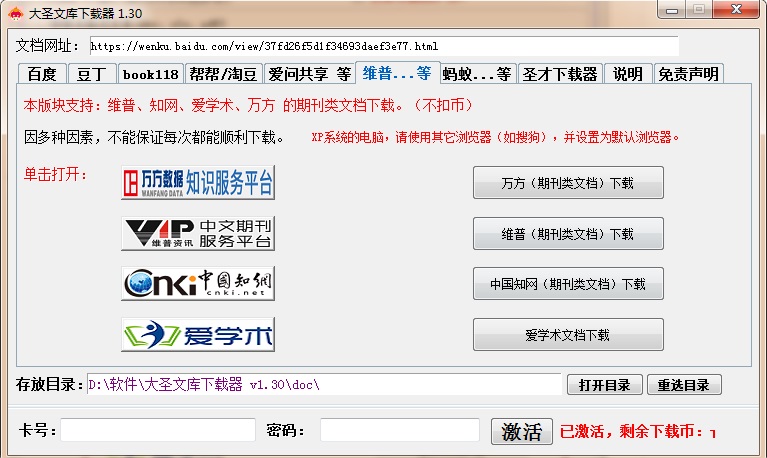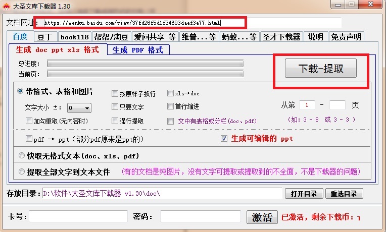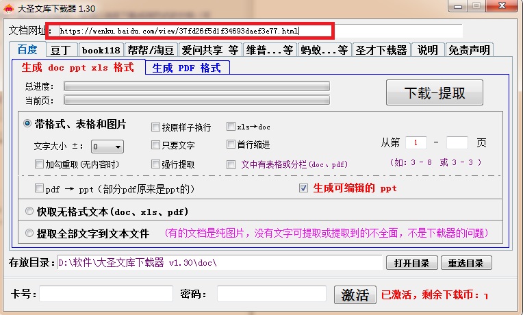 大圣文库下载器是一款百度文库下载器,可以帮助用户免费下载百度文库,豆丁,帮帮文库等文库资源,且下载为原格式,非常的实用,操作也十分简单。为此小编特别带来了大圣文库下载器破解版,已经成功激活,可以完全免费下载百度文库、豆丁、book118、帮帮文库,淘豆、爱问共享等多个文库的资源,同时还增加了支持维普、知网等学术网站,最重要的是,都是原格式下载,可以帮助用户免积分下载各种文库资源。需要说明的是:本款大圣文库下载器激活版每次打开好像都要激活一下,激活会提示下载币,这个可以无视,用户只要将下载的文库链接粘贴软件里面,再点击下载提取即可。【软件特点】