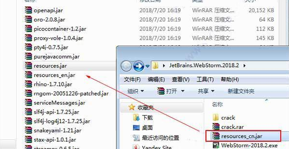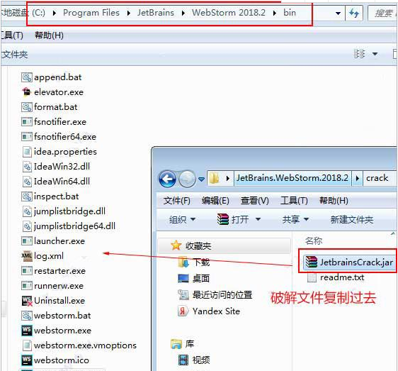 5、这时将破解文件Crack.rar解压出来,再将“JetbrainsCrack.jar”复制到软件安装目录【C:\Program Files\JetBrains\WebStorm 2018.2\bin】;