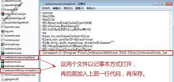 6、再用记事本打开“webstorm.exe.vmoptions”和“webstorm64.exee.vmoptions”这两个文件,再后面添加破解文件的路径,就是中括号中的内容【-javaagent:C:\Program Files\JetBrains\WebStorm 2018.2\bin\JetbrainsCrack.jar】