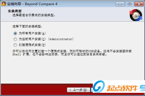 这一步需要选择Beyond Compare的安装类型,需要选择是为所有用户安装,为当前用户安装或是创建便携式安装。极速小编选择了为所有用户安装,点击[下一步]继续安装;