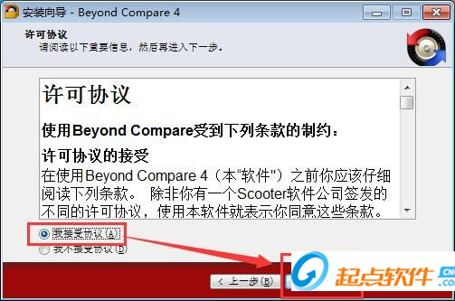 接下来我们要阅读Beyond Compare的授权协议。如果你接受协议中的条款,点选[我接受协议]。如果你选定 [取消] ,安装程序将会关闭。必须接受协议才能安装Beyond Compare。点击[我接受协议]后点击[下一步]继续安装;