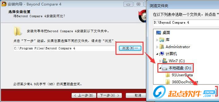 这一步需要我们确定Beyond Compare的安装路径,安装程序有默认的安装路径:C:\Program Files\Beyond Compare 4。安装Beyond Compare需要4.9MB的磁盘空间。需要修改路径的朋友可以点击[浏览],选择需要安装的文件夹后,点击[确定]就可以修改安装路径了。点击[下一步]就可以开始安装Beyond Compare了;